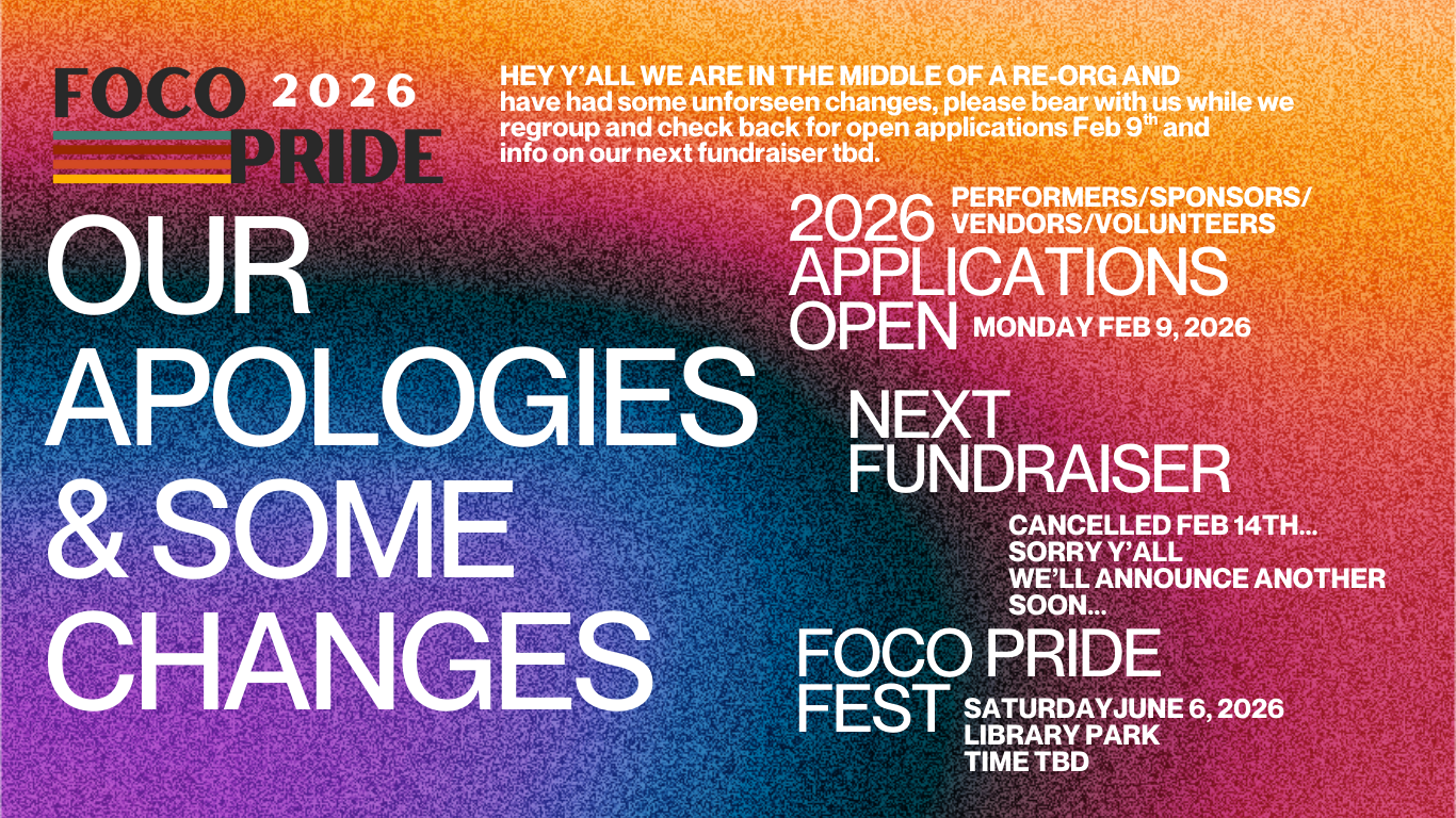 We will have apps out for vendors, performers and volunteers by end of day Friday Feb 13…thank you for your continued patience. - Foco Pride we did it, let’s do it again! Grateful for our Sponsors for helping us make our First FoCo Pride a Success!